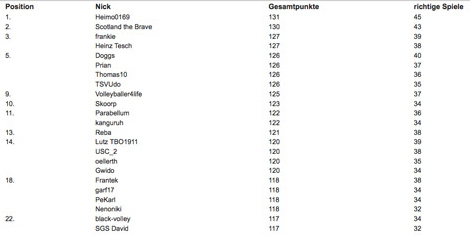 Platz zwei der Gesamtwertung belegt „Scotland the Brave” mit 130 Punkten vor „frankie” und „Heinz Tesch”, die jeweils 127 Punkte haben, „frankie” hat aber ein Spiel mehr richtig getippt.